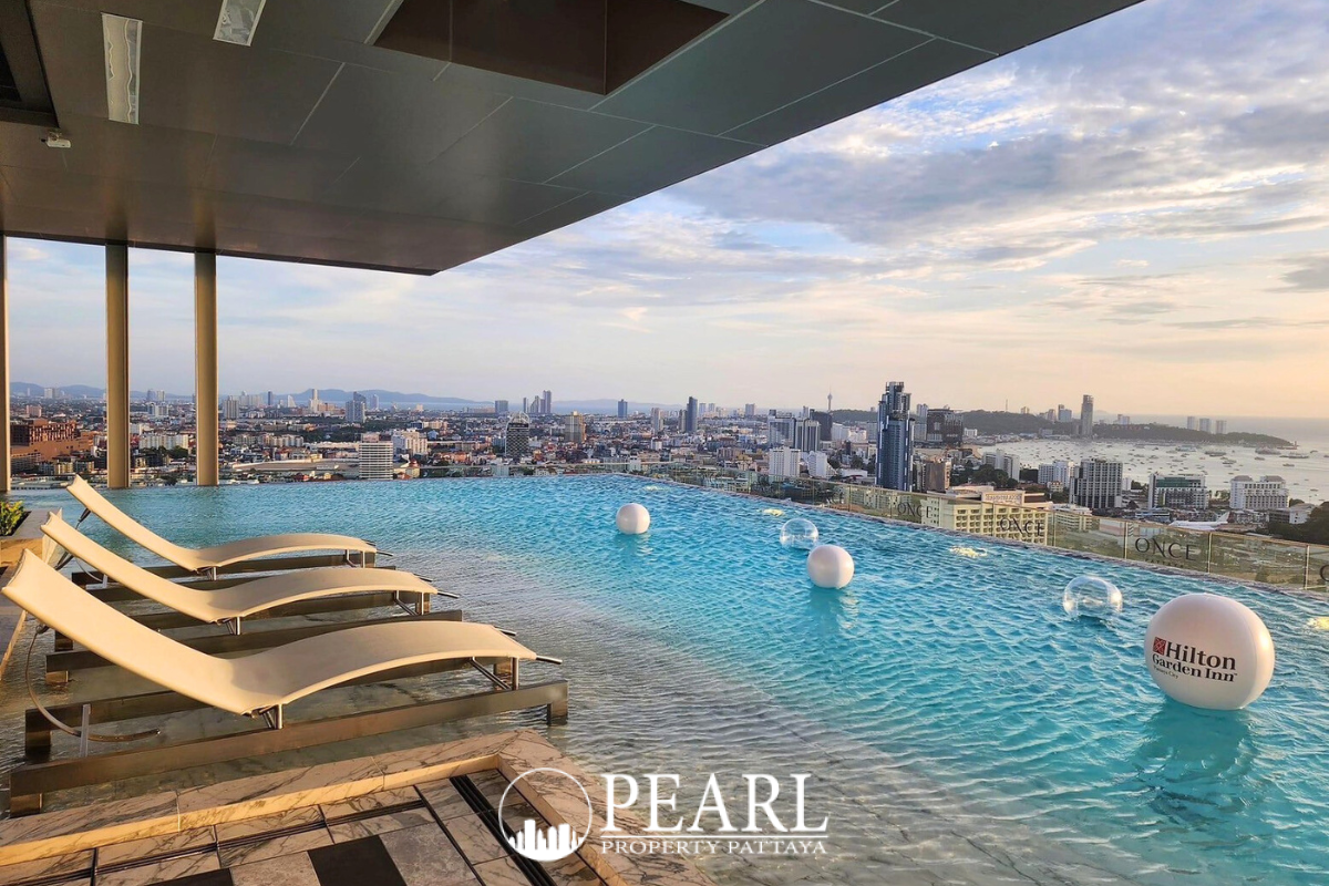 Discover Once Pattaya, a prestigious mixed-use high-rise development that redefines luxury living in North Pattaya. Developed by Honour Group and completed in early 2023, this impressive 32-story tower stands as a beacon of contemporary elegance and functional design. Spanning approximately 3,715 square meters, Once Pattaya offers 427 premium condominium units, ranging from efficient studios at 28-29 sqm, comfortable one-bedroom residences at 34 sqm, and spacious two-bedroom units from 51.8 to 59.8 sqm. For those seeking expansive living, three-bedroom and penthouse units are available, boasting generous sizes from 119 to 201 sqm. Residents of Once Pattaya are treated to an unparalleled resort-like lifestyle, thanks to its extensive array of amenities. Indulge in breathtaking views from the infinity-edge rooftop pool and Jacuzzi, while children enjoy their dedicated pool. Maintain your fitness routine at the sky fitness gym or find serenity with flying yoga in the sky garden. The development also features a children's playroom, the stylish Once More Bar, and the "Once Working Space" for your professional needs. A grand lobby, concierge services, 24-hour security with CCTV, and covered parking ensure convenience and peace of mind. Adding to its allure, Once Pattaya incorporates an onsite Hilton Garden Inn branded residence, providing residents with hotel-standard services, shuttle service, and designated parking. Strategically located along Chalermprakiet (Pattaya Sai 3) Road in vibrant North Pattaya, Once Pattaya offers exceptional connectivity and lifestyle benefits. Residents are just steps away from world-class shopping destinations like Terminal 21 and Central Festival Mall, alongside an abundance of dining hotspots and entertainment venues. Bangkok Hospital is a mere six-minute drive, ensuring easy access to top-tier medical care. This prime location perfectly blends urban excitement with the tranquility of coastal living, with the sea just over a kilometer away, making Once Pattaya an ideal choice for international buyers and renters seeking a sophisticated and convenient lifestyle in Thailand.